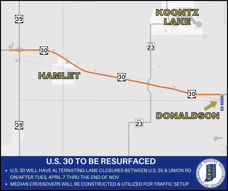Lane closures on U.S. 30 in Starke & Marshall counties