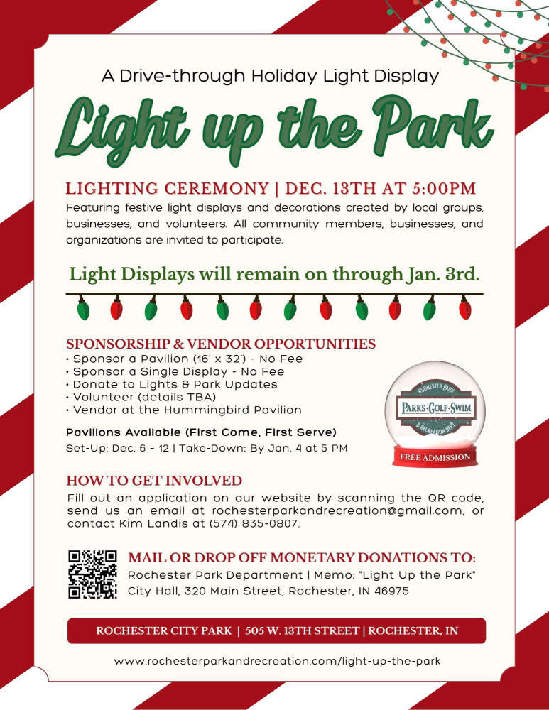 A Lighting Ceremony will be held on Dec. 13 at 5 p.m. in the Rochester City Park. Lights will remain in the park and be lit each evening at dusk from Dec. 13 to Jan. 3. The north entrance from Park Road will be closed during that time and those wanting to drive around the park to enjoy the light display are asked to enter through the east entrance near the baseball diamond.