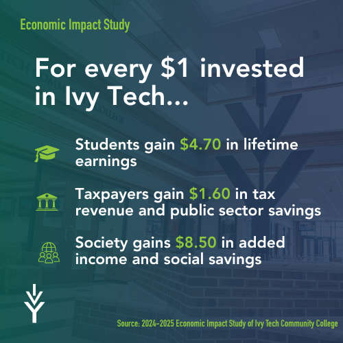 The report found that for every $1 invested in Ivy Tech, taxpayers get a return of $1.70, and further impacts are felt by the lifestyle improvements that come with added skills and education. Students can get a return of $4.90 for every dollar spent by being able to earn more in their lifetime, and society can get a return of $9 on each dollar with added income and social savings.