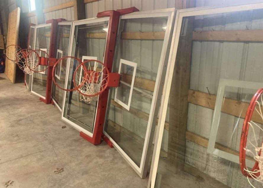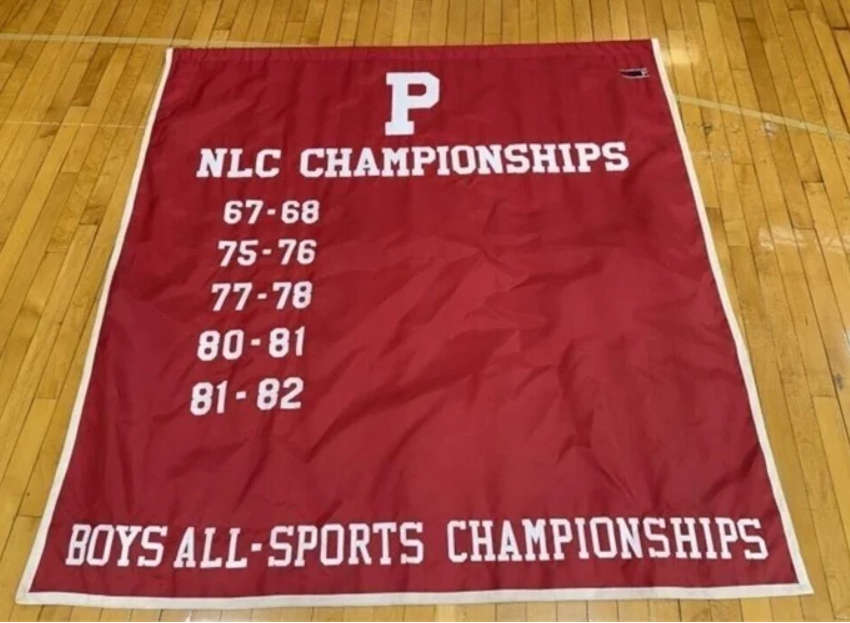 Bidders can vie for several unique items, including 4x4-foot individual floor sections featuring the letters that spell out "PILGRIMS" and "PLYMOUTH," as well as 3x3-foot sections with the "NLC" letters. The auction block also features several of the gym's basketball backboards and 30 historic banners that previously hung in the rafters—perfect additions for a local business, garage, or "Man Cave."