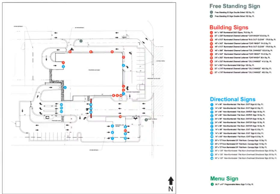 The 14 approved signs include two free-standing monument signs and 12 wall-mounted or building-mounted signs, all based on designs from Vanadco dated January 29.