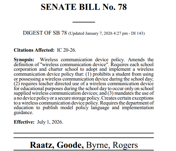 PCSC Superintendent says Indiana Bill would require strict "Bell-to-Bell" cellphone ban in schools