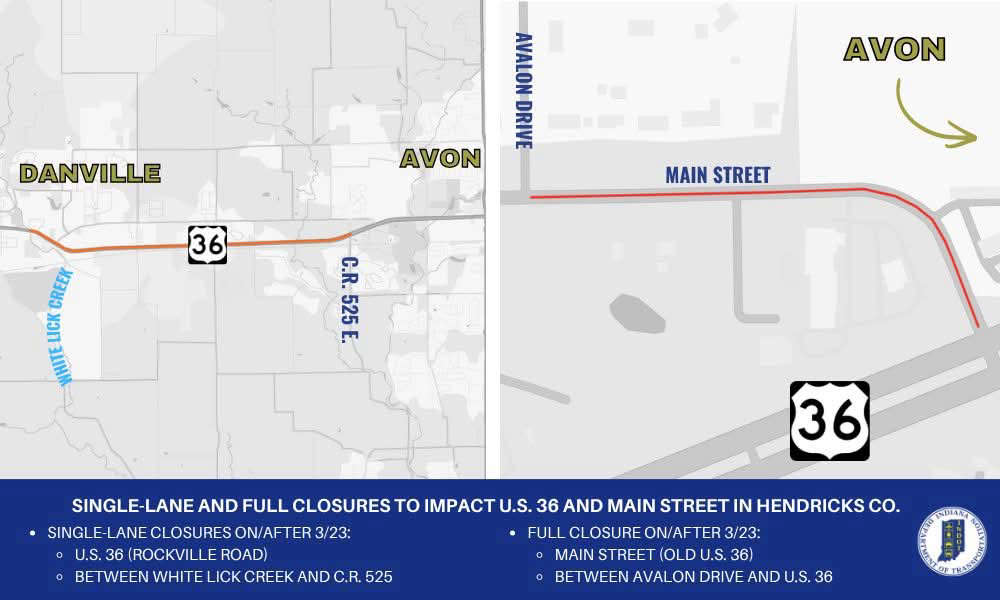 Single-lane and full closures to impact U.S. 36 and Main Street in Hendricks County