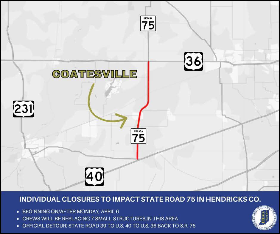 Several closures to impact State Road 75 in Hendricks County