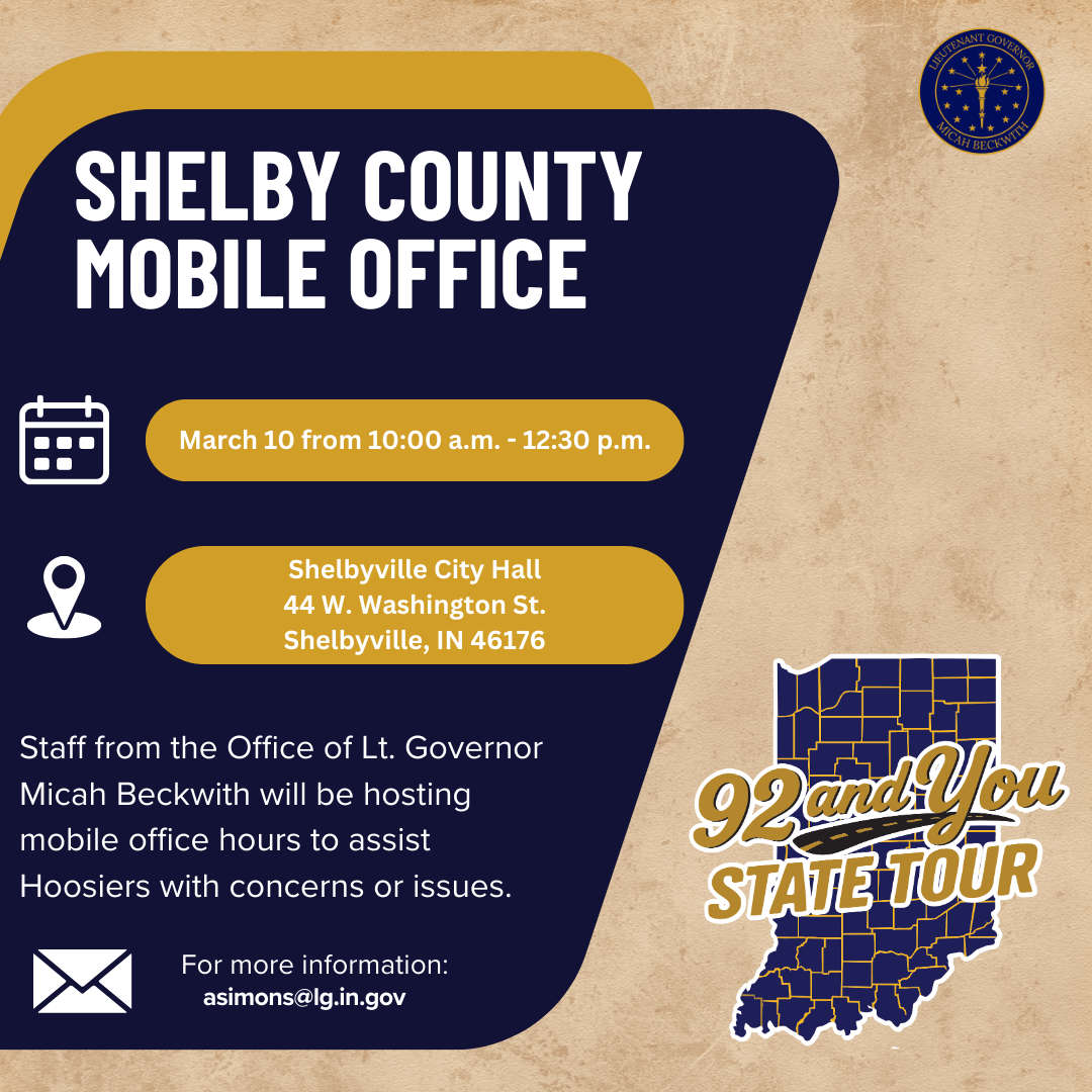 Staff from the office of Indiana Lt. Governor Micah Beckwith will host mobile office hours on March 10 in Shelbyville.