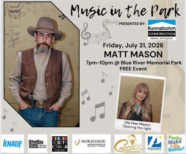 The Shelbyville Parks and Recreation Department has announced Matt Mason will perform a free concert on July 31 at Blue River Memorial Park.