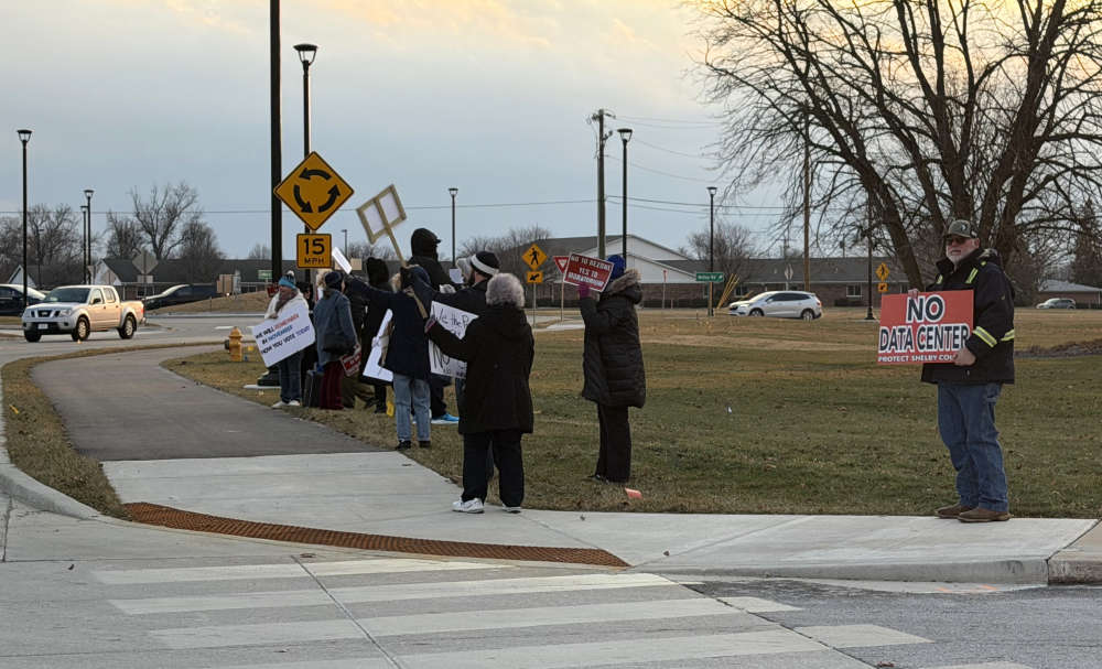 A small group staged a peaceful protest in front of Shelbyville High School Wednesday where the Shelbyville Common Council was set to vote on an annexation and rezoning request for a large parcel of property east of Interstate 74 along State Road 44 that has been targeted for a potential data center campus.