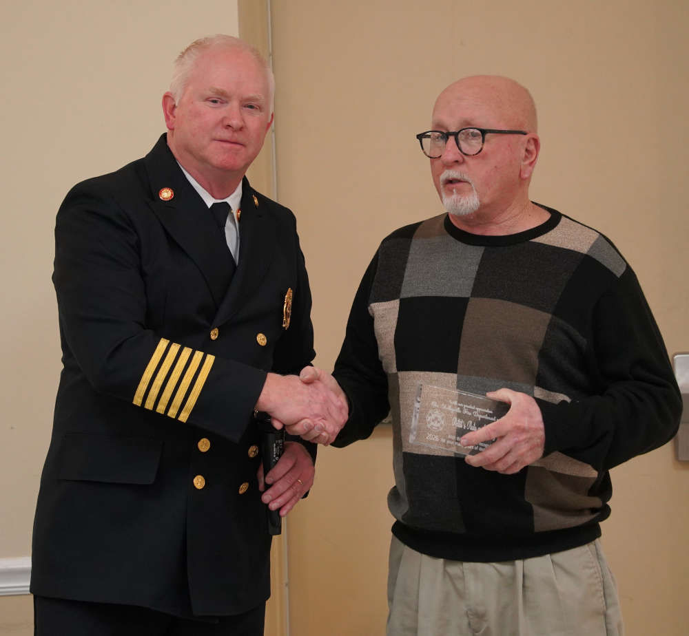 Shelbyville Fire Department Chief Doug Lutes (left) presents the Community Appreciation Award to Rusty Pettit.